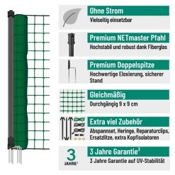 AKO PoultryNet Premium 25m Geflügelnetz, 106cm, 8 Verstärkte Pfähle, 2 Spitzen, Grün, Ohne Strom