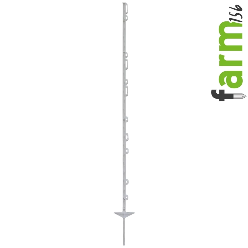 Der „farm156“ überzeugt durch seine 11 nützlichen Ösen, geeignet für alle gängigen Litzen, Seile und Weidebänder. Das Besondere an dem verbesserten „farm156“-Weidezaunpfahl ist sein verstärktes Kunststoffprofil mit Verstrebungen. Durch diese Bauweise hält er auch großen Belastungen stand. Verstärkt wird die Pfahl-Festigkeit durch den Glasfaseranteil im Kunststoff. Ein Doppelfußtritt mit einem massiven Stahlnagel gibt einen sicheren Stand. Ein Doppelfußtritt mit einem massiven Stahlnagel bietet einen festen Stand. Der praktische Doppelfußtritt mit massivem Stahlnagel sorgt für einen sicheren Stand des Pfahls.