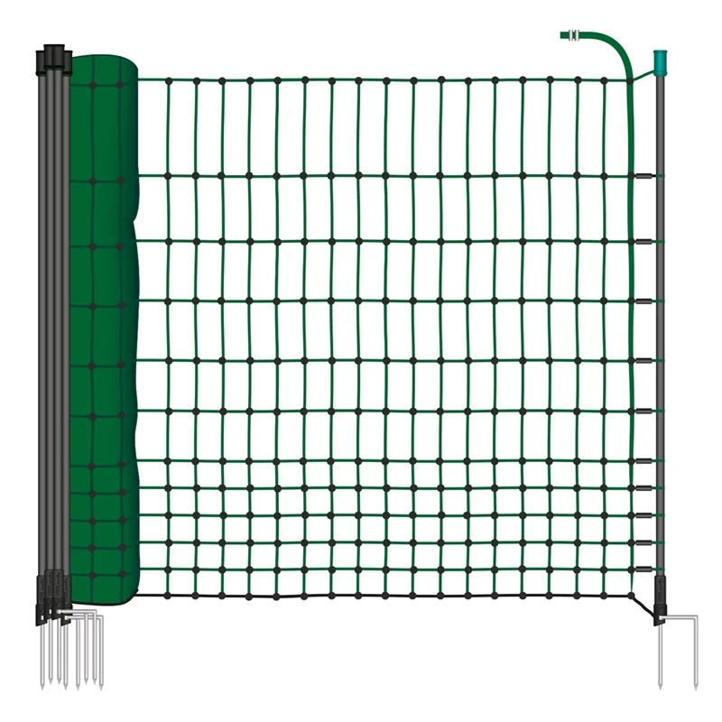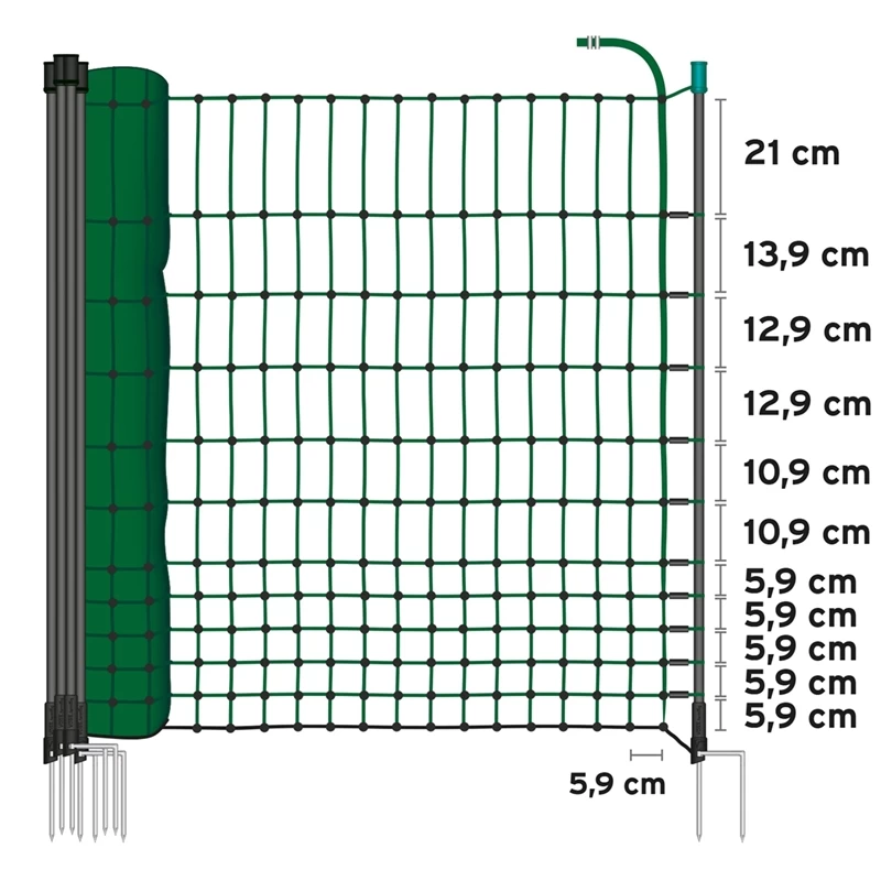 Dieses Geflügelnetz aus unserer VOSS.farming BASIC-Netzserie überzeugt durch seine gute Verarbeitung, die Praxistauglichkeit und den günstigen Preis bei guter Qualität! Das Netz hat eine Länge von 25 Metern, was die Einzäunung von kleinen Flächen, kurzen Strecken oder Durchgängen schnell und einfach möglich macht. Das Netz muss nicht per Hand gekürzt werden und man muss keinen Teil des Zauns aufgerollt lassen. Das 112cm hohe VOSS.farming BASIC-Netz kann in wenigen Minuten ohne Werkzeugeinsatz errichtet werden. Das einfache, leichte Design ermöglicht es, den Zaun schnell zu bewegen und umzusetzen. Das Weidezaunnetz kann für die verschiedensten Bereiche eingesetzt werden. Gerne wird das Hütenetz zum Einzäunen von Bereichen genutzt, wo kein Stromzaun benötigt wird, bzw. kein Strom genutzt werden darf. Ein stromloses Netz wird z.B. gerne dort aufgestellt, wo sich kleine Kinder im Bereich der Einzäunung aufhalten könnten oder bei Tierausstellungen mit Zuschauerverkehr. Einige Tiere lassen sich auch ohne Strom hüten. Das Netz weist im unteren Bereich eine sehr enge Maschenweite auf.