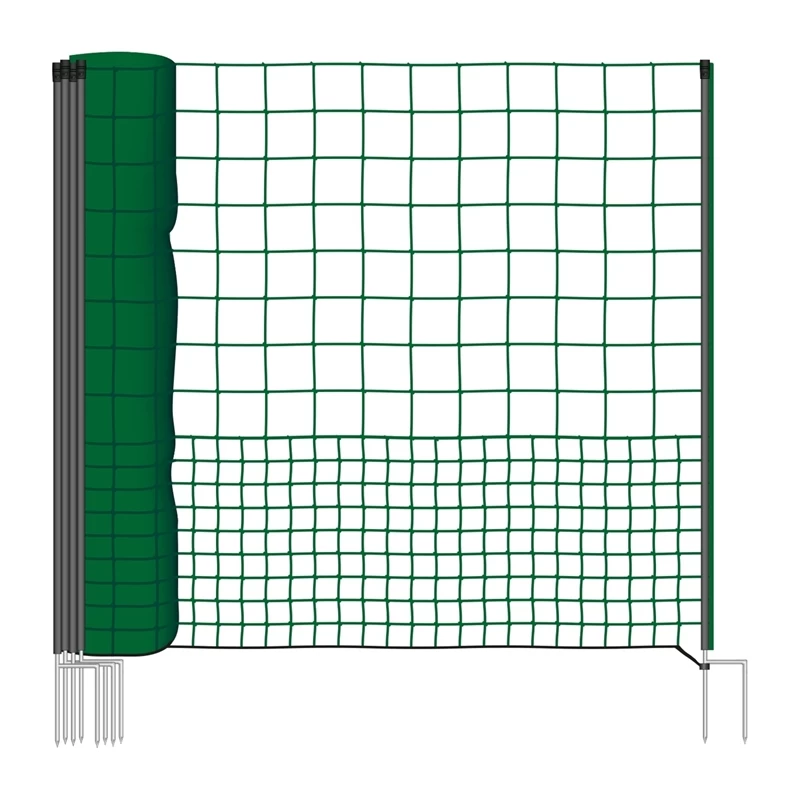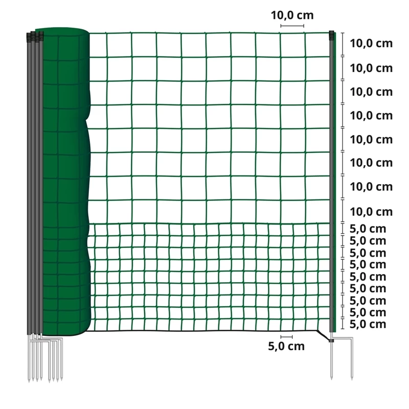 Das einfache, leichte Design ermöglicht es, den Zaun schnell zu bewegen und umzusetzen. Diese Handhabung erlaubt ein schnelles Einrichten von Geflügelgehegen. Das Weidezaunnetz kann für die verschiedensten Bereiche eingesetzt werden. Gerne wird das Hütenetz zum Einzäunen von Geflügel genutzt, weil diese empfindlich auf Strom reagieren. Ein stromloses Netz wird unter anderem auch gerne dort aufgestellt, wo sich kleine Kinder im Bereich der Einzäunung aufhalten könnten, oder bei Tierausstellungen mit Zuschauerverkehr. Einige Tiere wie z.B. Hühner lassen sich auch ohne Strom hüten. Das Netz weist im unteren Bereich eine sehr enge Maschenweite auf.