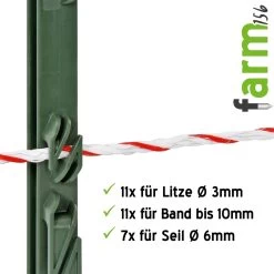 11 Ösen – 4 für Weideband und 7 für Weide-Seil – sind eine individuelle und sichere Einzäunung. Die dunkelgrüne Farbe des Pfahls „farm156“ passt sich dezent der Landschaft an und wird aus diesem Grund auch gern in Naturschutzgebieten verwendet.