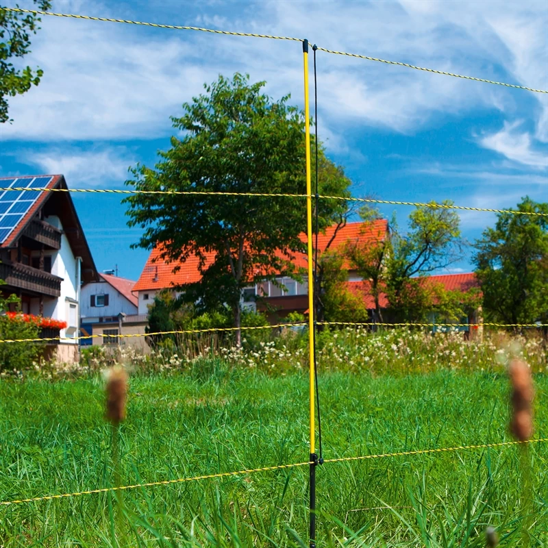 Das 50 Meter lange Elektronetz von AKO ist mit gelber Litze ausgestattet und so sehr gut für die Tiere sichtbar. Alle waagerechten Litzen sind stromführend. Alle Litzen sind mit 3 x 0,30 mm TriCOND-Leitern (0,18 Ohm/m) ausgestattet. Die 15 gelb/schwarzen Fiberglaspfähle mit Einzelspitze besitzen jeweils einen Kopfisolator und Bodenstopper, sodass ein selbständiges Lösen der Litze fast unmöglich ist. Die vertikalen Netzstreben wirken wie viele kleine Standpfähle und stützen das Netz zusätzlich ab!