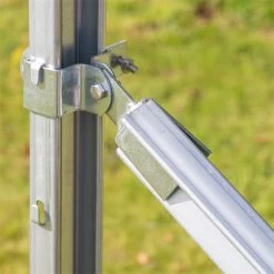 Für noch mehr Standfestigkeit und Stabilität können Sie Querverstrebungen anbringen. Hierfür wird der Z-Profilpfahl unten in die Aufnahmen des Erdtellers und oben in die Kappe gesteckt. Den Erdteller schlagen Sie im 45°-Winkel in die Erde, so verhindern Sie ein weiteres Eindringen oder Wegrutschen der Querstrebe. Jetzt können Sie die Schelle und die Kappe mit dem Z-Profilpfosten verschrauben. Durch ein Verschieben der Schelle können Sie den Druck auf die Querstrebe verändern, sodass der Z-Profilpfahl einen festen Halt hat.