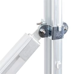 Für noch mehr Standfestigkeit und Stabilität können Sie Querverstrebungen anbringen. Hierfür wird der Z-Profilpfahl unten in die Aufnahmen des Erdtellers und oben in die Kappe gesteckt. Den Erdteller schlagen Sie im 45°-Winkel in die Erde, so verhindern Sie ein weiteres Eindringen oder Wegrutschen der Querstrebe. Jetzt können Sie die Schelle und die Kappe mit dem Z-Profilpfosten verschrauben. Durch ein Verschieben der Schelle können Sie den Druck auf die Querstrebe verändern, sodass der Z-Profilpfahl einen festen Halt hat.