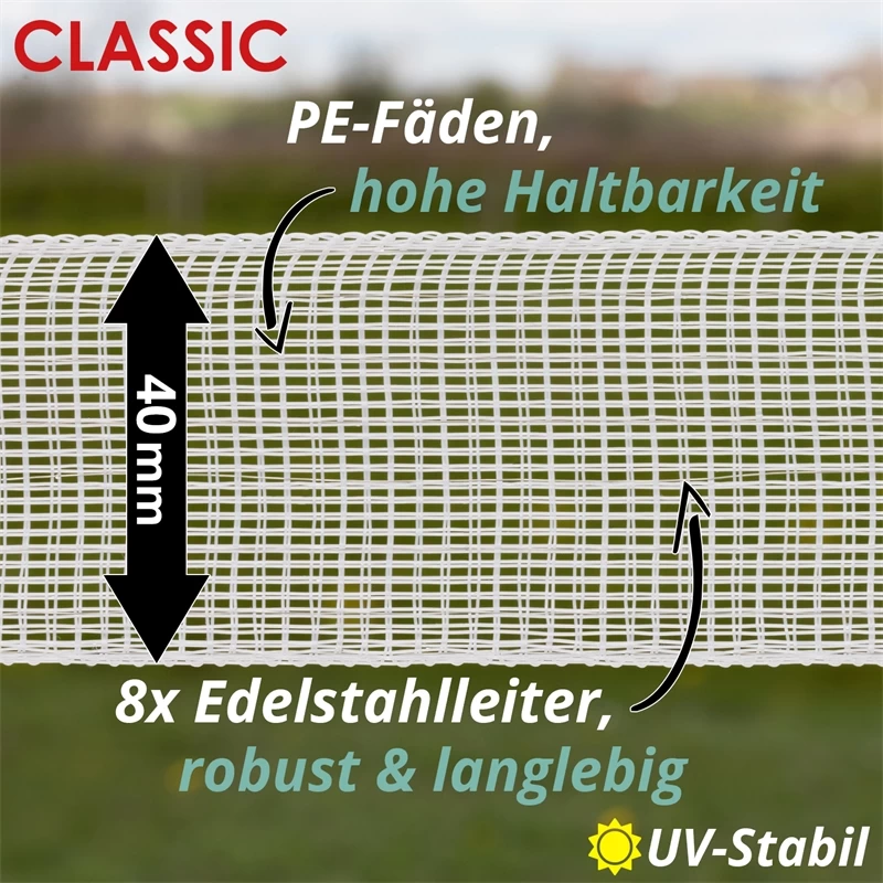 Weidezäune sind einer hohen Belastung ausgesetzt, sollen lange schützen und Tiere sicher hüten – das „CLASSIC“ Weidezaunband ist dafür sehr gut geeignet! Dank der 8 stabilen Edelstahlleiter und dem UV-beständigen Kunststoff aus PE-Monofilien ist das Weidezaunband widerständig und langlebig. Das hochwertige Leitermaterial eignet sich gut für kürzere und einfache Zäune.
