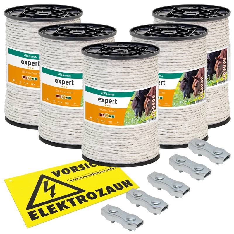 5x Weidezaunseil je 200m + 5x Verbinder + Warnschild!