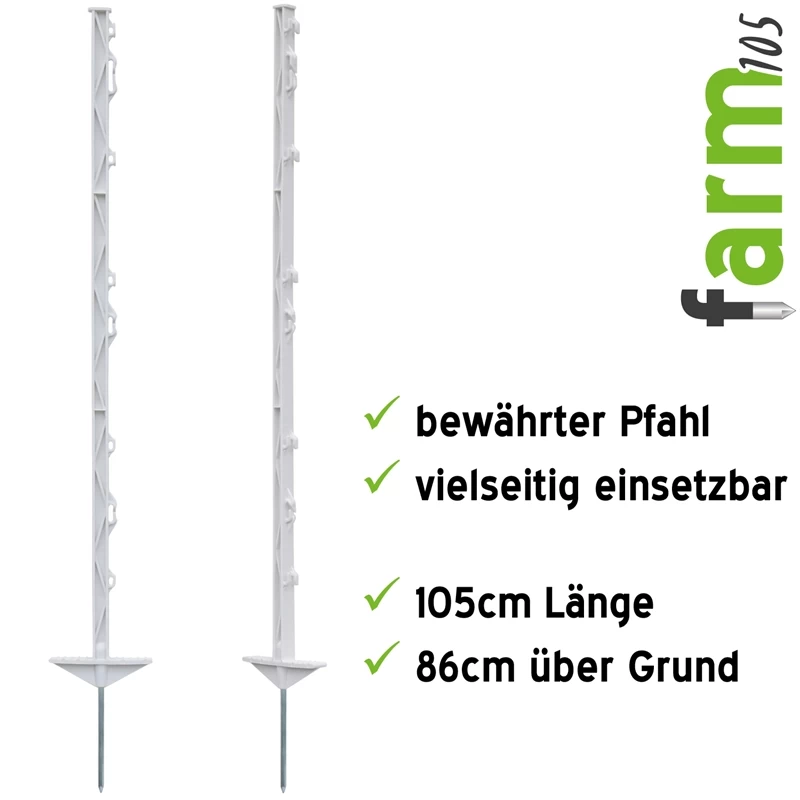 Dieser Kunststoffpfahl hat einen hohen Glasfaseranteil für eine hohe Stabilität. Der stabile Stahlnagel und die praktische Trittstufe ermöglichen Ihnen eine schnelle und leichte Montage. Der VOSS.farming Weidezaunpfosten „farm 105“ eignet sich mit seinen 105cm Höhe – davon 86cm über der Erde – zum Einzäunen von Ziegen, Schafen, Kühen und sogar zur Wildtierabwehr.
