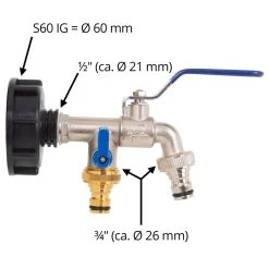 - 1x Anschlusshahn für IBC-Container mit 2 Schnellkupplungen, separat absperrbar