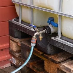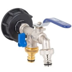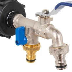 Leichtere Wasserentnahme aus dem IBC-Container. Endlich keine Überschwemmung mehr! Außerdem können Sie zwei Schläuche oder auch eine Pumpe getrennt oder gleichzeitig nutzen.