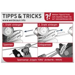 Die mitgelieferte Spannzange ermöglicht Ihnen ein kontrolliertes, messbares und reguliertes Spannen. Dank der Hebelwirkung ist die Handhabung denkbar einfach. Sie können Ihren Drahtzaun hiermit Spannen und Nachspannen. Ein eingebautes Messgerät zeigt Ihnen die Spannkraft an, so dass Sie einen Zaun mit sehr guter Drahtspannung aufbauen können.