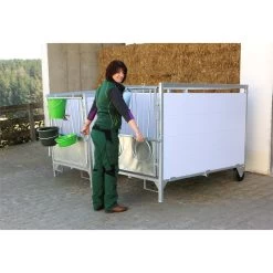 Ein offener Spalt, im oberen Bereich der Seitenwände, ermöglicht Blickkontakt zu den anderen Tieren. Die Seitenwände sind aus PVC-Paneele mit glatter Oberfläche gefertigt und daher leicht zu reinigen. Die Kälberbox bietet des Weiteren eine in beide Richtungen öffnende Drehtür mit zwei absperrbaren Fressöffnungen. Außerdem ist die Box inklusive einer Tränkeeimerhalterung und zwei klappbaren Eimerhaltungen.