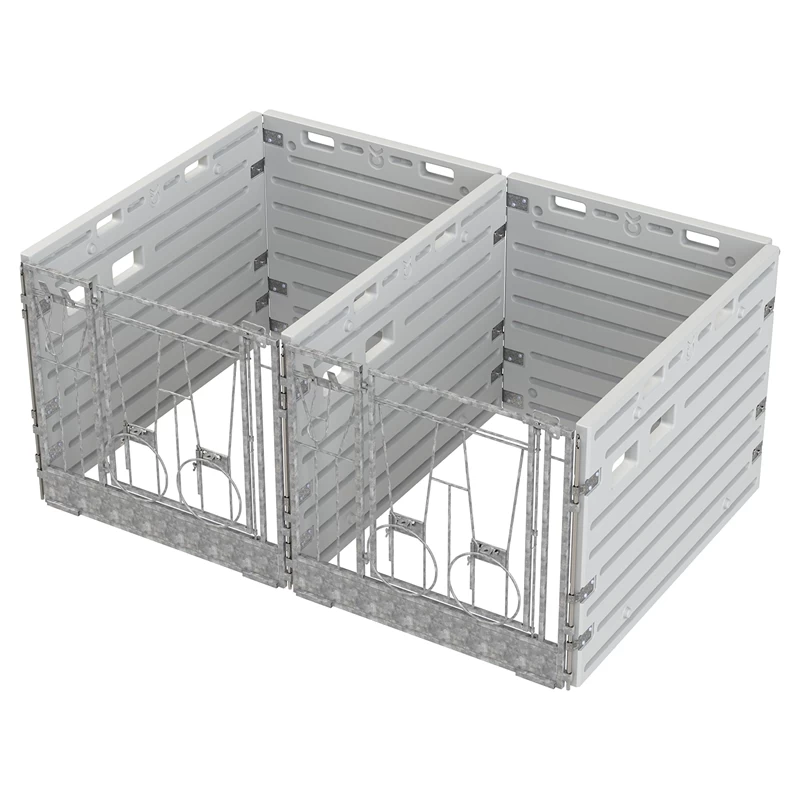 Die modulare Kälberbox bietet eine Stapellösung und bis zu 1,8m² Platz (1,60 x 1,15m) pro Box. Bis zu drei Boxen können zu einer Gruppenbucht kombiniert werden. Die robusten Kunststoffwände mit Versteifungssicken sind leicht zu reinigen und bieten durch die Sozialkontaktöffnung Kontakt zu anderen Kälbern. Das Frontelement verfügt über eine durchschwenkbare Drehtür und einen feststehenden Tränkebereich, gut geeignet zum Anlernen der Kälber an Nuckeltränken.