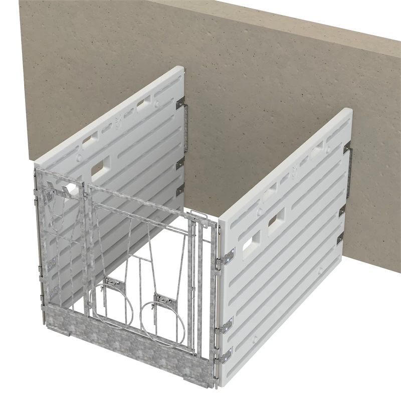 Die modulare Kälberbox bietet eine Stapellösung und bis zu 1,8m² Platz (1,60 x 1,15m) pro Box. Bis zu drei Boxen können zu einer Gruppenbucht kombiniert werden. Die robusten Kunststoffwände mit Versteifungssicken sind leicht zu reinigen und bieten durch die Sozialkontaktöffnung Kontakt zu anderen Kälbern. Das Frontelement verfügt über eine durchschwenkbare Drehtür und einen feststehenden Tränkebereich, gut geeignet zum Anlernen der Kälber an Nuckeltränken.