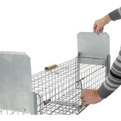 Die Lebendfalle ist mit schnell schließenden Falltüren versehen und aus einem feuerverzinktem Drahtgeflecht mit 38 x 38mm gefertigt, dieser besitzt eine Drahtstärke von 3,3mm. Um Lockmittel wie Eier oder Fleisch in der Falle auslegen zu können, ist ein Zubehörset enthalten, welches eine Metallzange, einen Eierhalter und einen Fleischspieß enthält.