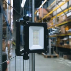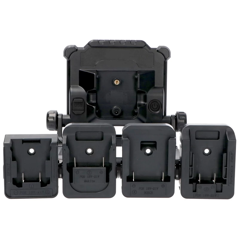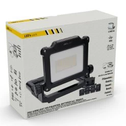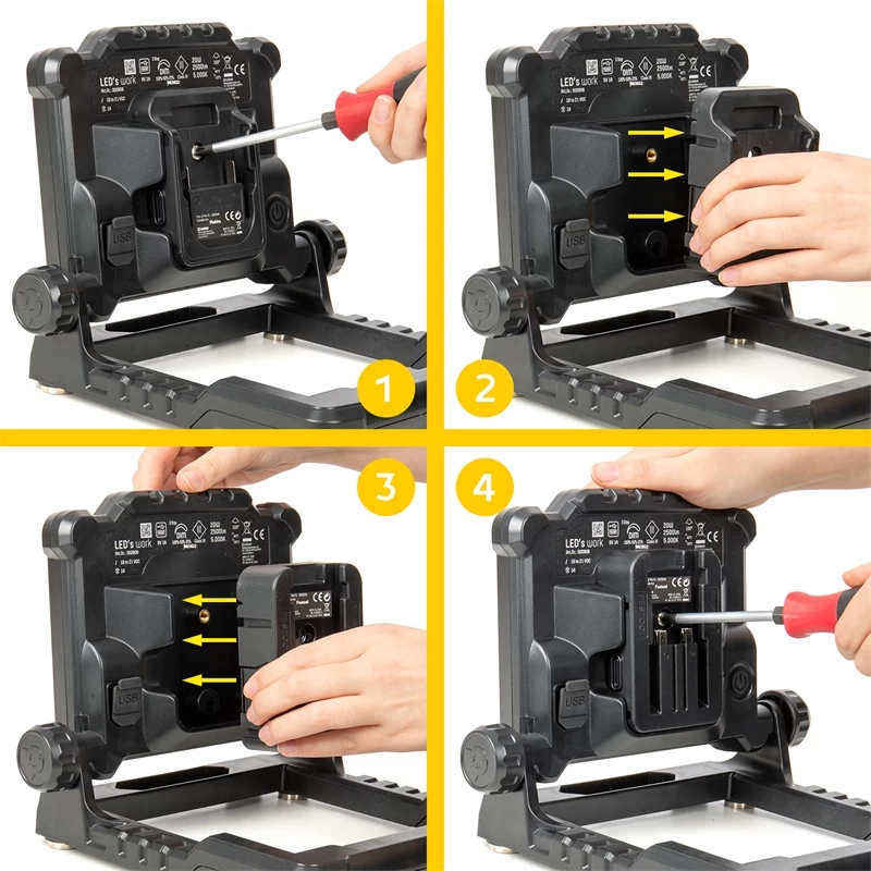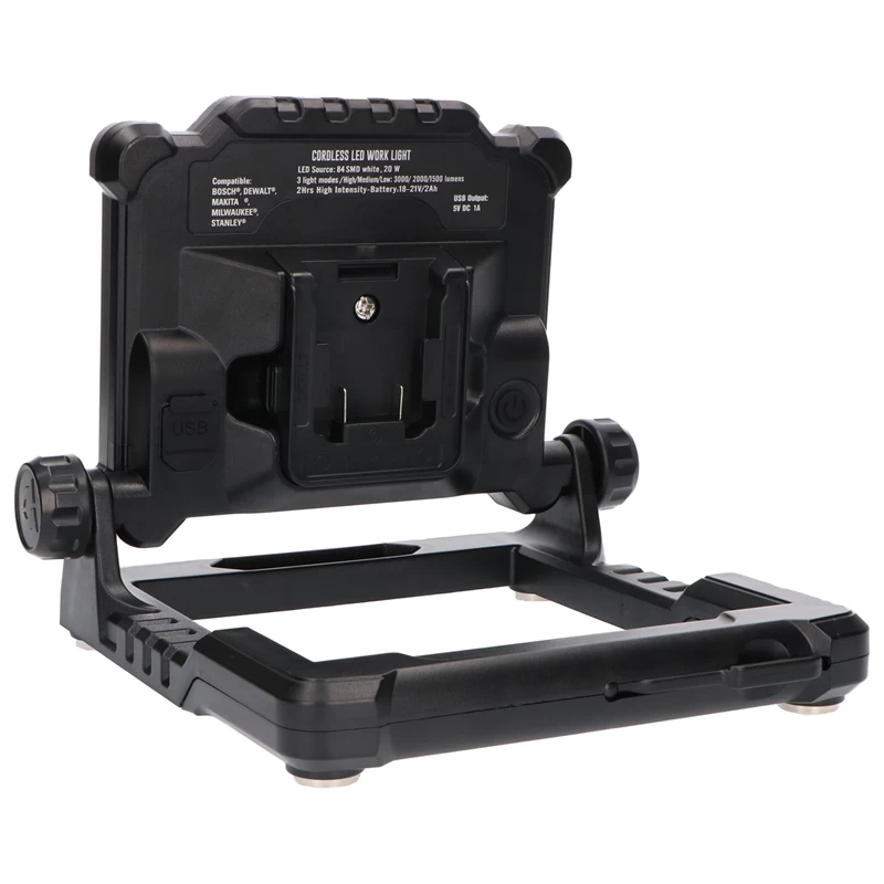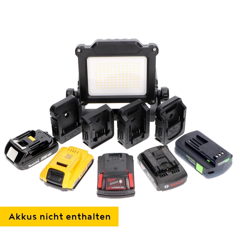 Die Arbeitsleuchte wird inklusive vier Adapter geliefert, um Akkus von 18 bis zu 21 Volt der Marken Makita, DeWalt, Milwaukee, Bosch und Festool verwenden zu können. Zusätzlich verfügt der Strahler über einen rückseitigen USB-Anschluss zum Aufladen von Smartphones oder anderen Geräten. Die Arbeitsleuchte hat die Schutzart IP20 und ist somit für den Einsatz in Innenräumen geeignet.