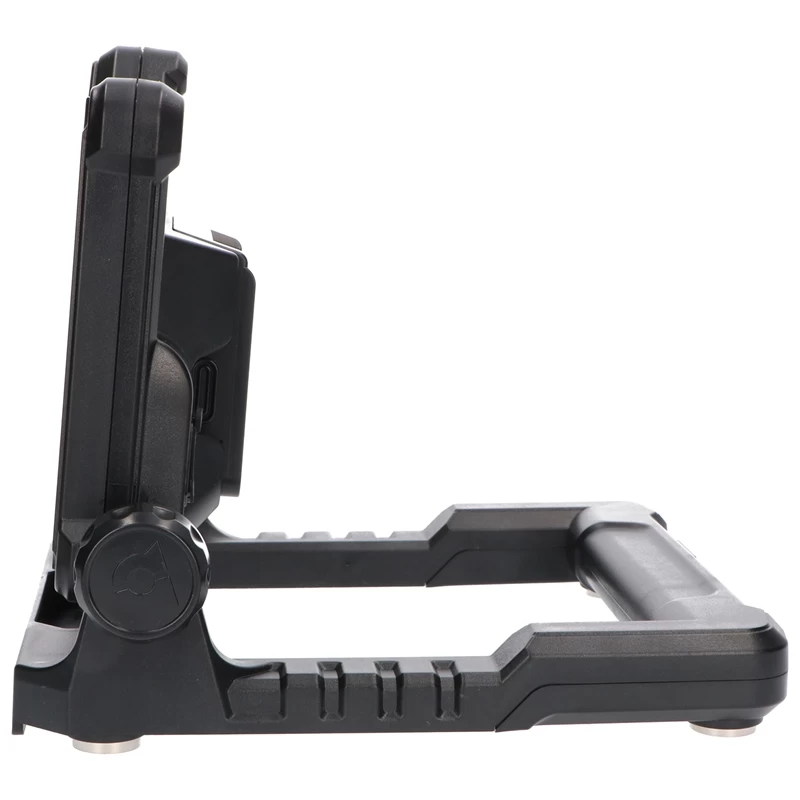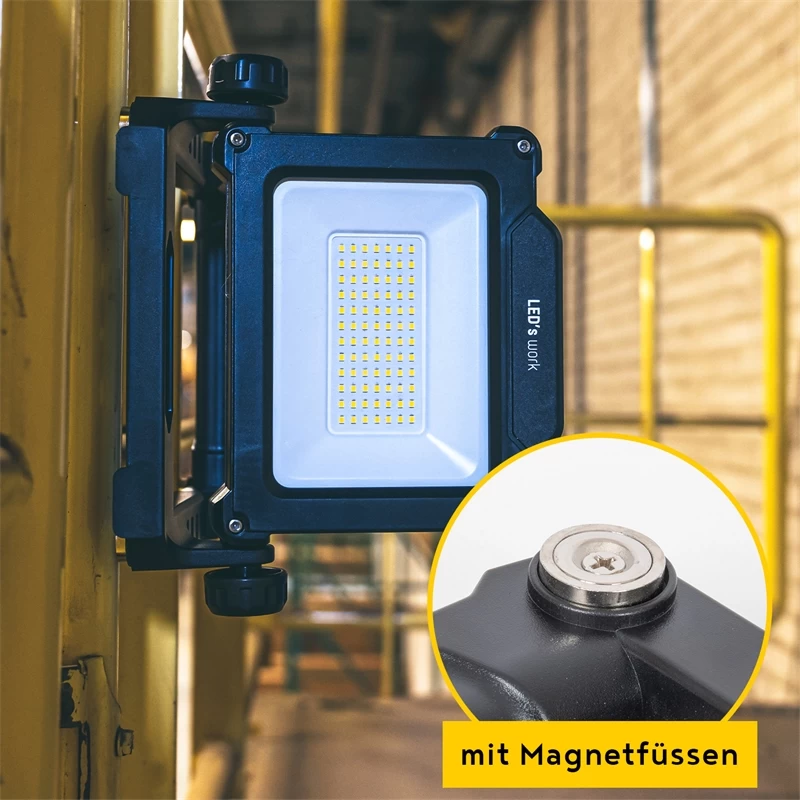 Der LED-Arbeitsstrahler ist faltbar, leicht zu transportieren und wiegt nur 1,1 kg. Er verfügt über eine stabile Standfläche, einen Haken zum Aufhängen und einen Magnethalter auf der Rückseite. Die seitlichen Köpfe können individuell arretiert werden, um die passende Leucht-Position zu finden.