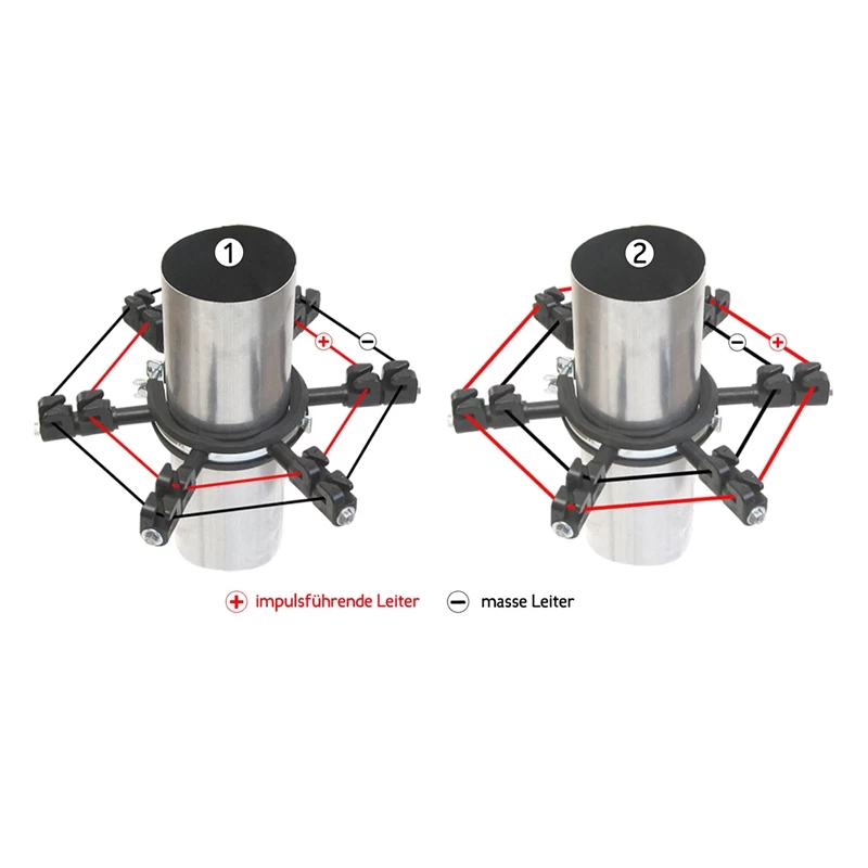 Der Anschluss des Weidezaungerätes erfolgt mit einem hochspannungsfesten Kabel. Es werden der + Pol(Impulszuleitung) und – Pol (Masse) des Gerätesdirekt an die Leiter angeschlossen. Sie können den Fallrohrisolator mit den Dachrinnenisolatoren Art.Nr.46001 und 46010 kombinieren, es muss lediglich eine Verbindung mit den Leitern hergestellt werden.