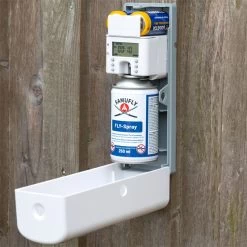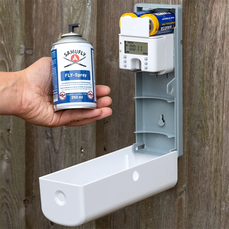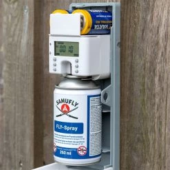 Günstiges Komplettset: Sprühautomat mit passendem SAMUFLY FLY-Spray und Batterien – kein weiteres Zubehör erforderlich, sofort installationsbereit!