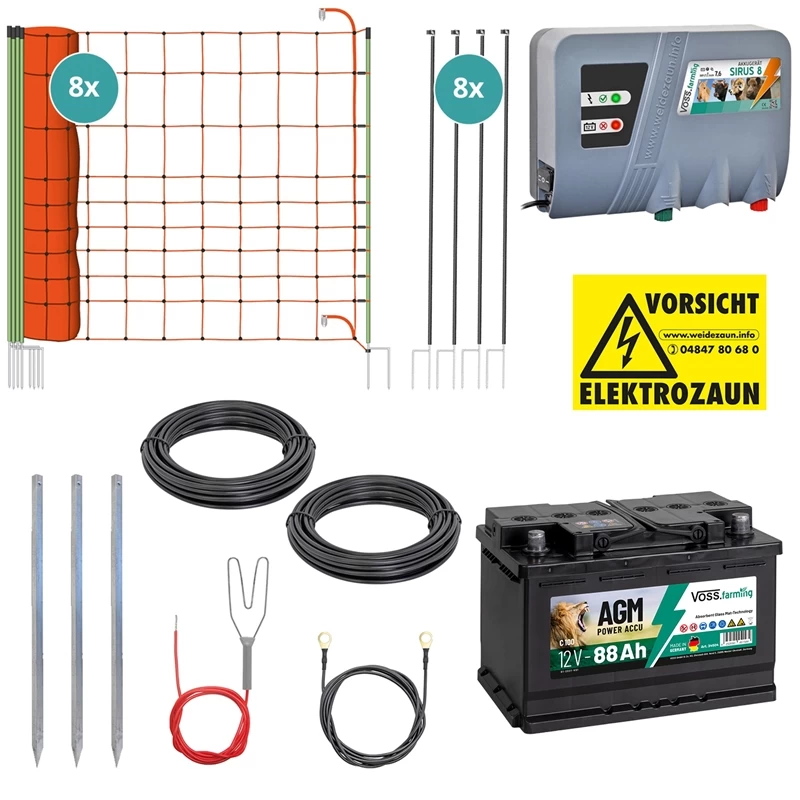 Zu unserem Premium-Komplettset gehört das 12V WeidezaungerĂ€t VOSS.farming „SIRUS 8“, welches fĂŒr ausreichenden Schutz am Zaun sorgt und den Wolf sicher von Ihren Tieren fernhalten wird. Der mitgelieferte VOSS.farming „12V AGM Akku 88Ah“ fĂŒr WeidezaungerĂ€te ermöglicht es Ihnen, den Wolfszaun auch ohne Netzanschluss sicher unter Strom zu setzen. FĂŒr einen festen Stand und um ein DurchhĂ€ngen des Netzes zu verringern, liegen dem Set 8 sehr stabile NetFix-Streben bei. SĂ€mtliche Anschlusskabel und ErdpfĂ€hle, die Sie zum Aufbau Ihres Wolfzaunes benötigen, sind inklusive. Sie treffen mit dem Wolfszaun-Komplettset von VOSS.farming eine sehr gute Wahl, denn das Zaunsystem ist einfach und schnell aufgebaut.