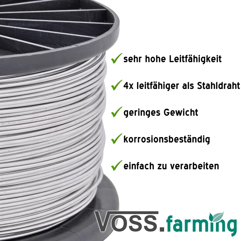 Der Aluminiumdraht für den Weidezaun punktet durch seine hohe elektrische Leitfähigkeit. Die Leitfähigkeit ist ca. 4-mal besser als bei unserem Stahldraht und ca. 2-mal besser als bei unserem Kupferdraht. Der Aluminiumdraht von VOSS.farming zeichnet sich durch seinen sehr geringen Widerstand von nur 0,01 Ω/m aus, was einer sehr hohen Leitfähigkeit entspricht. Damit können große Entfernungen nahezu ohne Spannungsverluste überwunden werden. Ein weiterer Vorteil ist das geringe Gewicht. Gegenüber Stahldraht ist Aluminiumdraht 66 % leichter. Alu-Draht lässt sich sehr einfach verarbeiten, er ist geschmeidig in der Anwendung.