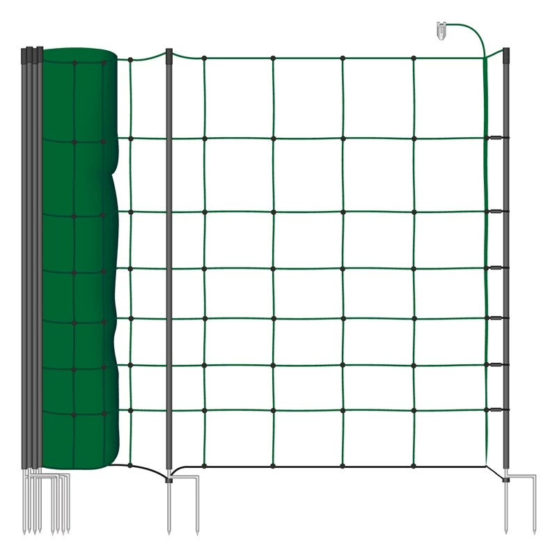 Eine Besonderheit bei diesem Netz sind die 20 stabilen, schwarzen Standpfähle mit 2 Spitzen. Der engere Pfahlabstand sorgt für einen noch festeren Stand und verhindert ein Durchhängen des Netzes. Die Pfähle selbst enthalten jeweils einen Kopfisolator und einen Bodenstopper zur Befestigung der Litze. Zum Elektrozaunnetz erhalten Sie gratis ein Reparaturset dazu.