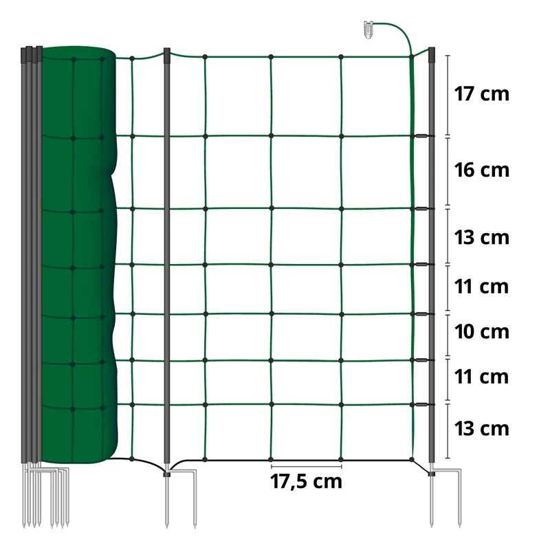 Das Netz ist 90 cm hoch, hat eine Länge von 50 Metern und ist leicht zu transportieren. So kann ein Zaun überall, schnell und ohne Werkzeug errichtet werden. Es ist mit tannengrüner Litze ausgestattet, wodurch es sich besonders gut der Umgebung anpasst. Von den 8 waagerechten Kunststofflitzen sind 7 stromführend. Die oberste Litze hingegen ist besonders verstärkt, mit 3 x 0,20 mm Edelstahlleitern und einem verzinnten Kupferleiter 1 x 0,20 mm ausgestattet und weist eine hohe Leitfähigkeit auf. Die Bodenlitze ist schwarz und nicht stromführend, damit bei Bewuchs kein Spannungsverlust auftritt. Für die guten Hüteeigenschaften sorgt zusätzlich eine Kunststoffplombe an jedem Maschenkreuzpunkt, die dort für Mensch und Tier unlösbar verschweißt ist.
