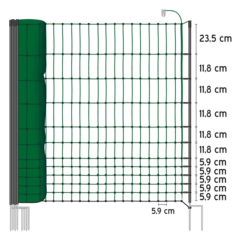 Das Netz hat eine Länge von 50 Metern und ist leicht zu transportieren. Deshalb kann schnell überall ein Zaun errichtet werden. Es ist mit kieferngrüner Litze ausgestattet, wodurch es sich gut der Natur anpasst. Die natürliche Farbe ist sehr unauffällig und bietet sich daher gut für die Nutzung in Naturschutzgebieten an. Auch im eigenen Garten fügt sich das kieferngrüne Netz gut ein, ohne das Gesamtbild durch grelle Farben zu stören. Von den 12 waagerechten Kunststofflitzen sind 11 stromführend und mit 3x 0,2mm nicht rostenden Edelstahlleitern versehen. Die Bodenlitze ist schwarz und nicht stromführend. Für die guten Hüteeigenschaften sorgt zusätzlich eine Kunststoffplombe an jedem Maschenkreuzpunkt, die dort für Mensch und Tier unlösbar verschweißt ist.
