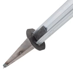 Der Z-Profilpfahl wird unten in die Aufnahmen des Erdtellers und oben in die Kappe gesteckt. Den Erdteller schlagen Sie im 45°-Winkel in die Erde, so verhindern Sie ein weiteres Eindringen oder Wegrutschen der Querstrebe. Jetzt können Sie die Schelle und die Kappe mit dem Z-Profilpfosten verschrauben. Durch ein Verschieben der Schelle können Sie den Druck auf die Querstrebe verändern, sodass der Z-Profilpfahl einen festen Halt hat.