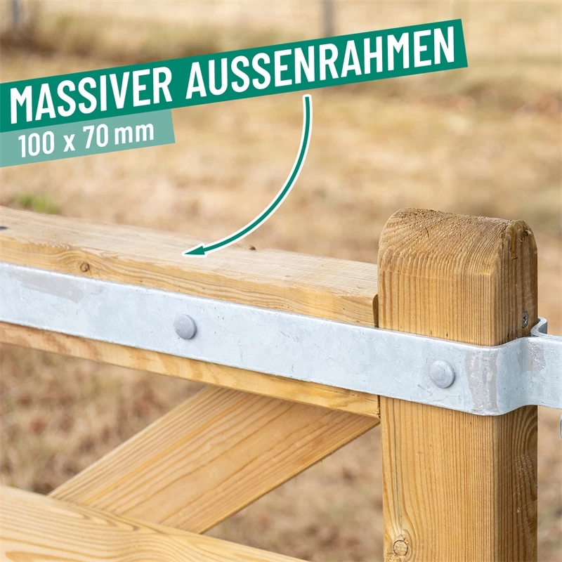 Mit unserem Weidetor im englischen Design schaffen Sie einen sicheren Zugang fĂŒr Weide, Paddock, GrundstĂŒck oder auch Garten und Hof. Das Tor ist aus Kiefernholz gefertigt und durch die KesseldruckimprĂ€gnierung gemÀà Gebrauchsklasse 4 (direkter Erdkontakt und stĂ€ndige Befeuchtung mit SĂŒĂwasser) vorbeugend gegen Insekten, Pilzbefall und ModerfĂ€ule geschĂŒtzt.