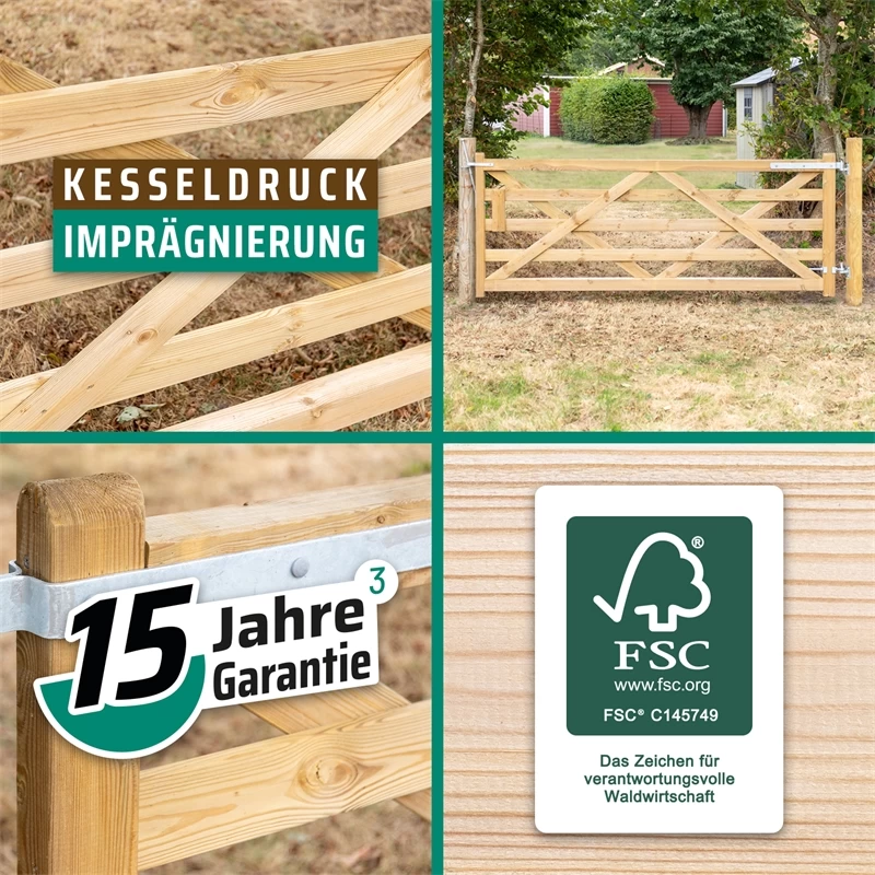 Mit unserem Weidetor im englischen Design schaffen Sie einen sicheren Zugang fĂŒr Weide, Paddock, GrundstĂŒck oder auch Garten und Hof. Das Tor ist aus Kiefernholz gefertigt und durch die KesseldruckimprĂ€gnierung gemÀà Gebrauchsklasse 4 (direkter Erdkontakt und stĂ€ndige Befeuchtung mit SĂŒĂwasser) vorbeugend gegen Insekten, Pilzbefall und ModerfĂ€ule geschĂŒtzt.
