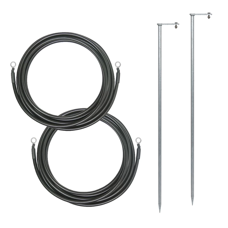 Ein Weidezaun kann technisch nur einwandfrei funktionieren, wenn die Erdung vorhanden und richtig abgestimmt ist. Wichtige Bestandteile für die Erdung sind der Erdstab und die Erdkabel. Damit sich Zaunbetreiber und Herdenhalter um die Zusammenstellung der Erdungskomponenten nicht mehr kümmern müssen, haben wir für Sie ein Erdanschluss-Set für mobile Weidezaungeräte fertig zusammengesetzt. Dieses Erdungs-Komplett-Set aus dem Hause VOSS.farming besteht aus Spezial-Erdpfählen und Erdpfahlverbindungskabeln. Der Spezialerdstab wurde aus feuerverzinktem Stahl gefertigt und sorgt für eine gute Erdung am Zaun. Der Erdungspfahl ist sehr gut für den mobilen Einsatz geeignet. Die Erdpfahlverbindungskabel sind hochspannungsisoliert und mit einer Kupferlitzenader ausgestattet.