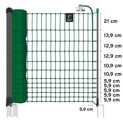 Das Geflügel-Komplett-Set umfasst ein grünes VOSS.farming® farmNET® aus unserer Premium-Netzserie. Dieses wurde insbesondere im unterem Bereich aus engen Maschen gefertigt, um Ihr Geflügel am Durchschlüpfen zu hindern. Ein weiterer Nutzen ist der Schutz Ihres Geflügels vor Räubern wie Fuchs, Marder oder Katze. Das Elektronetz eignet sich auch für große Geflügelarten, weil ein Ausbrechen aufgrund der Netzhöhe von 112cm deutlich erschwert wird. Mit den 16 stabilen NETmaster Pfählen und durch die 2 Spitzen an jedem Pfahl hat das Elektronetz einen festen Stand. Die NETmaster-Pfähle verfügen über eine noch höhere Stabilität, als unsere herkömmlichen Netzpfähle
