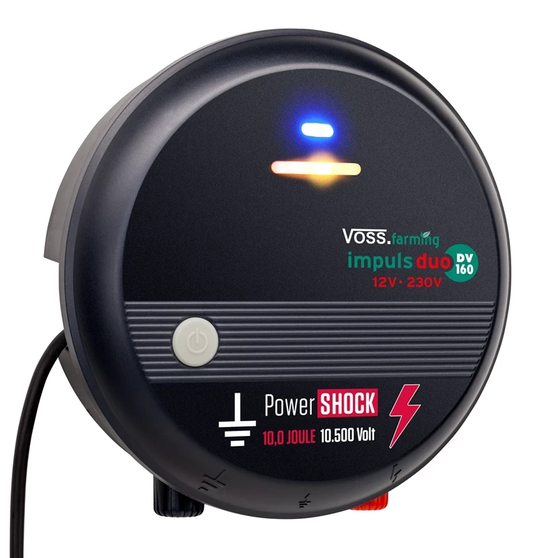 Extrem schlagstarkes 12V/ 230V DUO-Elektrozaungerät mit der PowerSHOCK Impulstechnologie. Das Kraftpaket mit einer Leistung von 10 Joule / 10.500 Volt verfügt, dank des optimierten Schlagimpuls, über einen hohen Schlagimpuls unter Praxisbedingungen – s. Leistungsdiagramm! Moderne Sicherheitstechnik, geringer Stromverbrauch und eine umfangreiche Geräteausstattung zeichnen dieses Gerät aus. Das VOSS.farming® „impuls duo DV160“ ist das ideale Gerät für sehr lange und schwierige Einzäunungen. Es eignet sich besonders für schwer zu hütende, unempfindliche Tiere, wie auch zur Wildtierabwehr. Besonders zur Abwehr von Wölfen empfiehlt sich dieses Gerät.