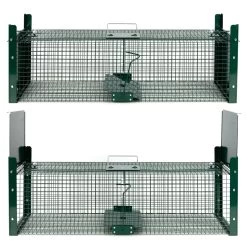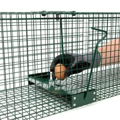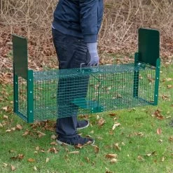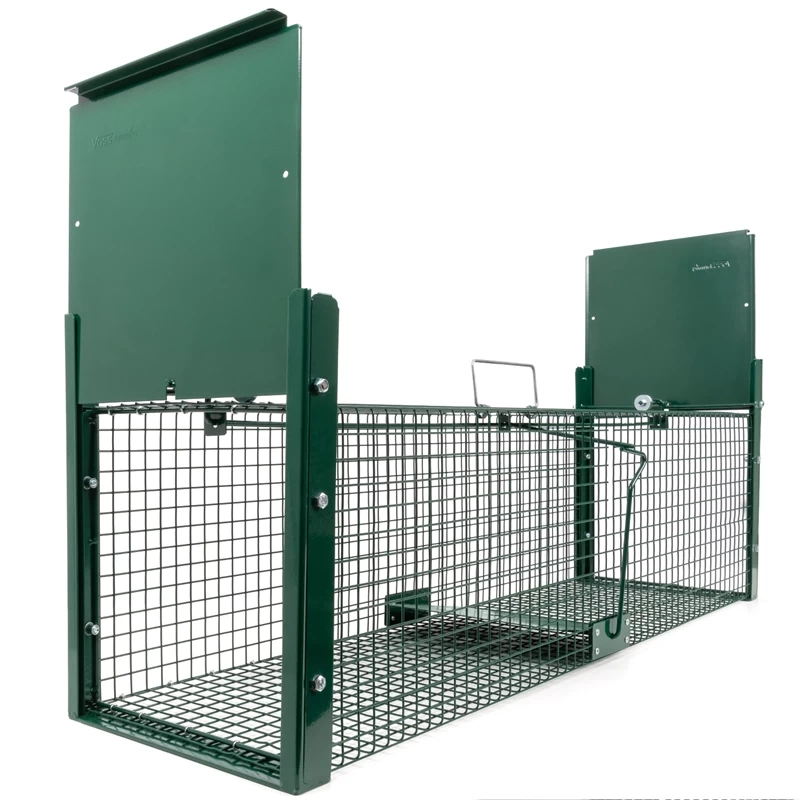 Die Lebendfalle verfügt über 2 ausbruchssichere und schnell schließende Falltüren. Die Türen haben eine Aushebelschutz-Verriegelung, sodass es dem gefangenen Tier unmöglich ist, die Falltüren von innen anzuheben. Die Tierfalle ist aus starkem Drahtgeflecht gefertigt, was sie besonders stabil und robust macht. Zum Transport der Falle befindet sich an der Oberseite ein Tragegriff. Unter dem Griff ist eine Platte befestigt, die Sie vor Beiß- und Kratzattacken schützt. Sie können die Lebendtierfalle sowohl draußen als auch drinnen einsetzen.