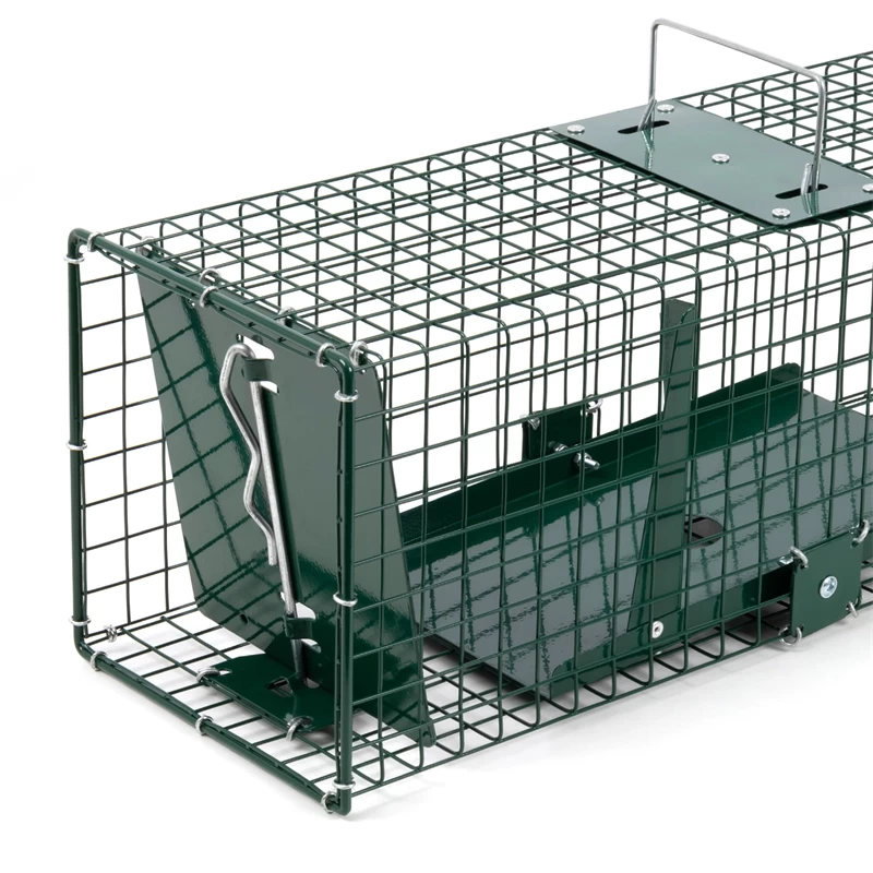 Die Lebendfalle verfügt über eine ausbruchssichere und schnell schließende Schnapptür. Die Tür hat eine Aushebelschutz-Verriegelung, sodass es dem gefangenen Tier unmöglich ist, die Falltür von innen anzuheben. Die Tierfalle ist aus starkem Drahtgeflecht gefertigt, was sie besonders stabil und robust macht. Zum Transport der Falle befindet sich an der Oberseite ein Tragegriff. Unter dem Griff ist eine Platte befestigt, die Sie vor Beiß- und Kratzattacken schützt. Auf einer Seite der Falle befindet sich eine Futterraufe, die durch eine separate Luke befüllbar ist. Sie können die Lebendtierfalle sowohl draußen als auch drinnen einsetzen.