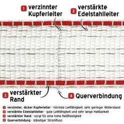 - Leiter-Querverbindungen: Alle 10 Leiterdrähte werden permanent reelektrifiziert, so kann keine Unterbrechung entstehen und es ist stets genügend Stromfluss im Zaun.