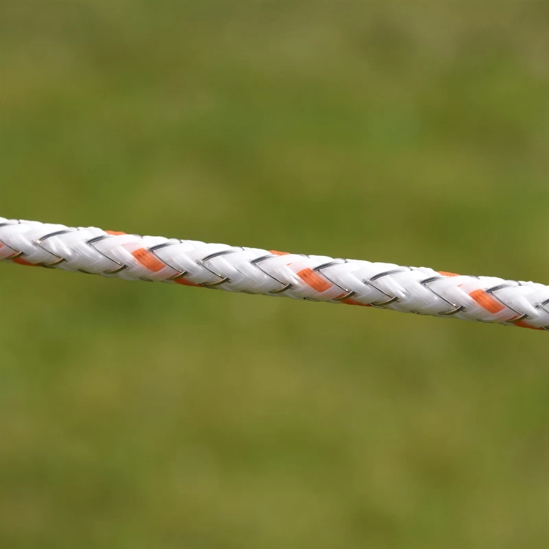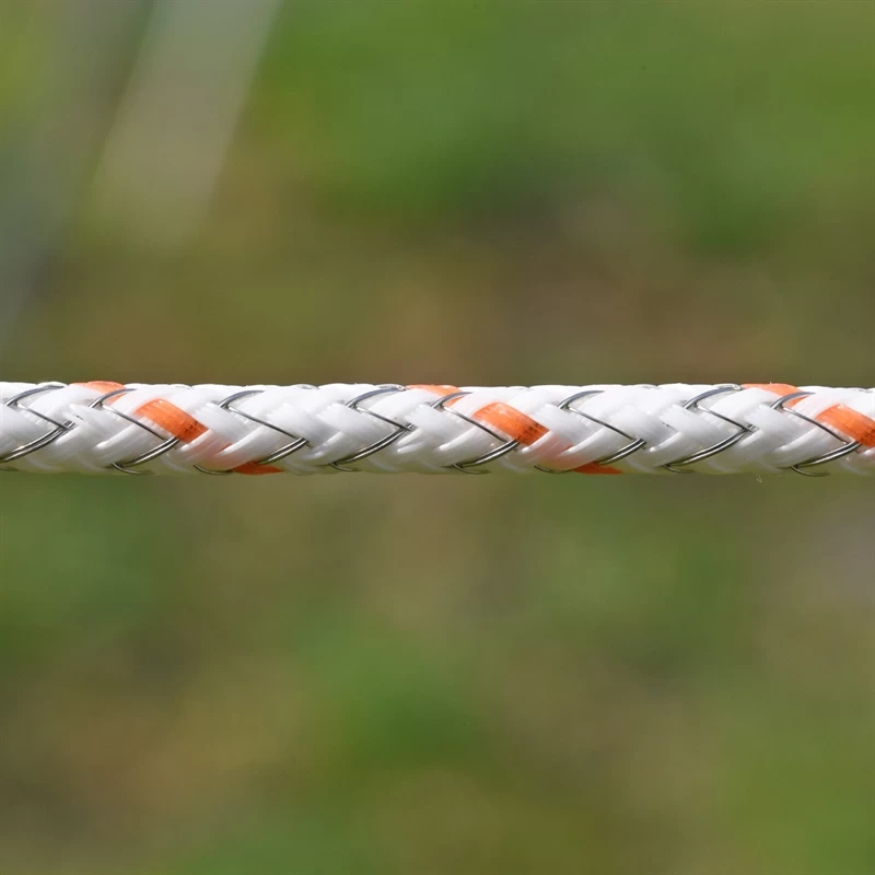 Dank außenliegender Drähte hat dieses geflochtene Seil einen geringen Spannungsabfall und eine hohe Spannungsübertragung zum Tier – ständige Re-Elektrifizierung!