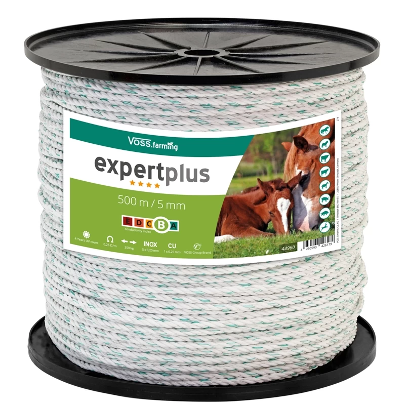 VOSS.farming „expertplus“ Weidezaun-Seil – 500m, 5mm, 5x 0,20 Niro + 1x 0,25 Kupfer, weiĂź-grĂĽn