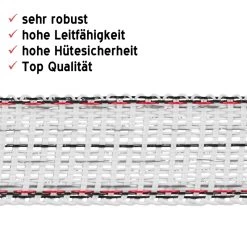 Eine zweifache Leiterbündelung am Rand sorgt für konstanten Stromfluss und Spannung am Zaun. Auch die hohe Reißfestigkeit sorgt zusätzlich für hohe Sicherheit bei Ihrer Zaunanlage.