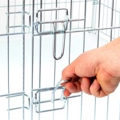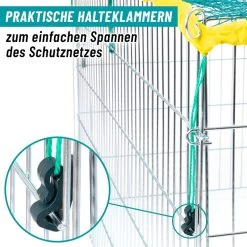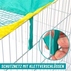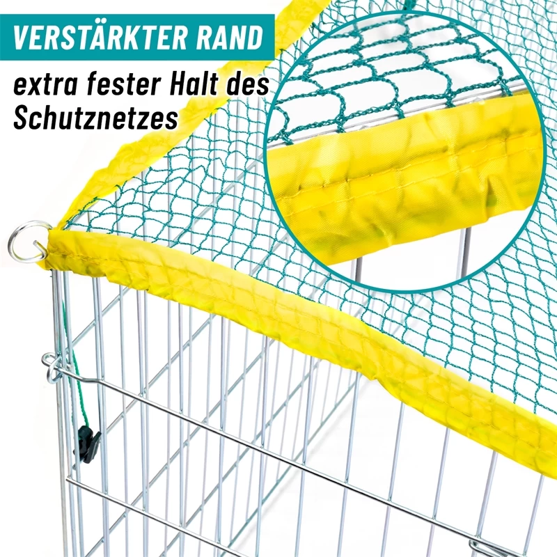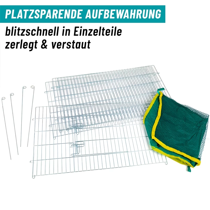 Unser Freilauf kann schnell und einfach errichtet werden. Die 4 verzinkten Zaunelemente werden durch Stäbe miteinander verbunden. In einem der Zaunelemente befindet sich eine Tür, die mit einem Riegel abgesichert werden kann. Das Schutznetz aus Nylongewebe unterbindet Ausbruchsversuche und schützt vor Feinden, wie Katzen oder Vögel.
