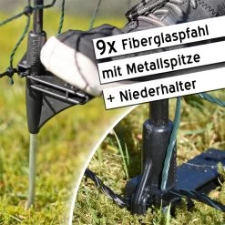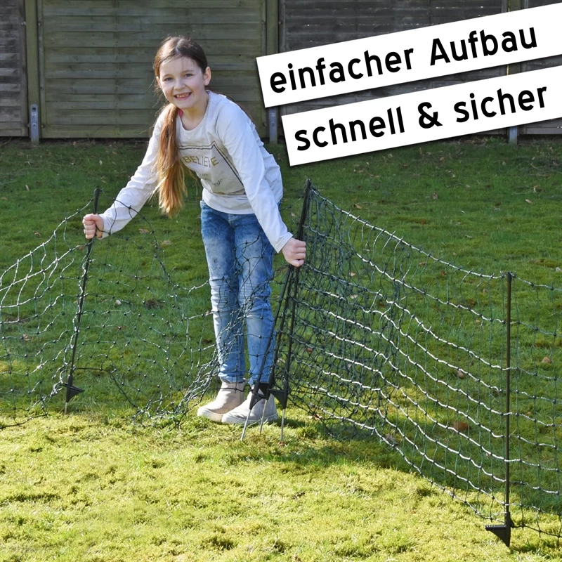 Die stabilen schwarzen Standpfähle sind nicht nur robust, sondern sorgen für einen sicheren Stand, auch bei weichem Boden. Der Pfahl ist mit einer Spitze ausgestattet, die mit Widerhaken in diesem verankert ist. Die Pfähle können einfach mit dem Fuß in den Boden getreten werden. Dank des geringen Pfahlabstands wird ein Durchhängen des Netzes verhindert. Zum Elektrozaunnetz erhalten Sie 20 Heringe gratis.