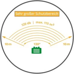 Mit dem VOSS.sonic 2200 können Sie einen Bereich von ca. 115 qm abdecken. Außerdem hat der VOSS.sonic 2200 einen Erfassungswinkel von 130° und deckt somit eine große Fläche ab. Das 3-fach Blitzlicht ist auffallend sichtbar und strahlt in einem großem Winkel aus. Hierdurch wird die Abwehr noch zusätzlich erhöht.
