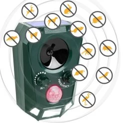 Sobald der Bewegungsmelder aktiviert wird, beginnt das Gerät eine Gruppe von Schallsignalen auszusenden, deren Frequenzen auf der jeweiligen Einstellung beruhen. Die Tiere können sich üblicherweise nicht an die ständig wechselnden Gruppen von Schall- und Ultraschall gewöhnen. Sie werden aus dem beschallte Gebiet vertrieben. Der zuschaltbare 3-fach Blitz verstärkt die Abschreckung.