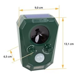 Ultraschall-Vertreiber mit Akku, Solarzellen, USB-Ladeanschluss und zusätzlicher Blitzlicht-Funktion.