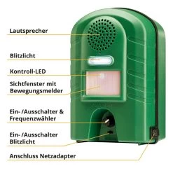 - 9 einstellbare Ultraschallstärken – je nach Einstellung der Frequenz können unterschiedliche Tiere vertrieben werden
