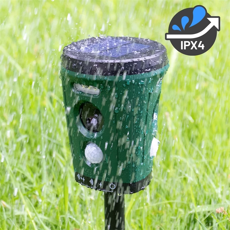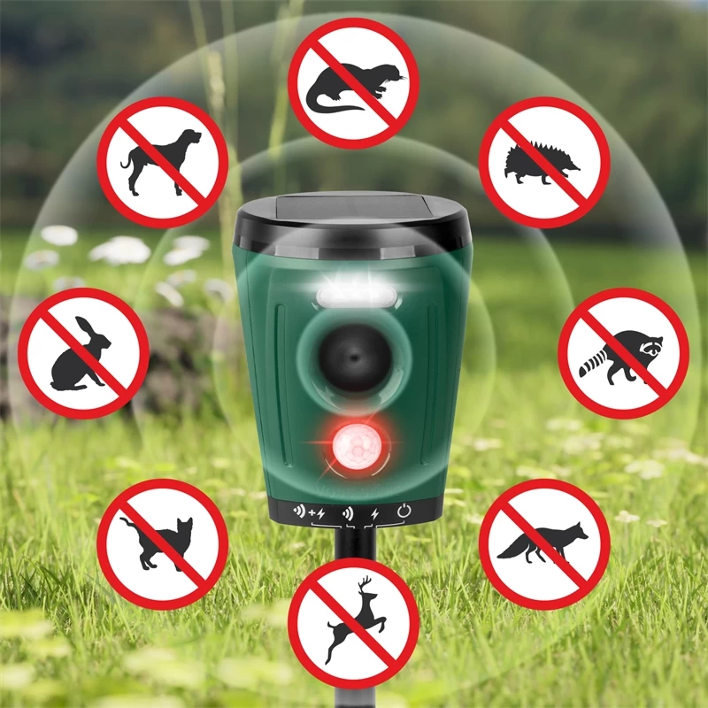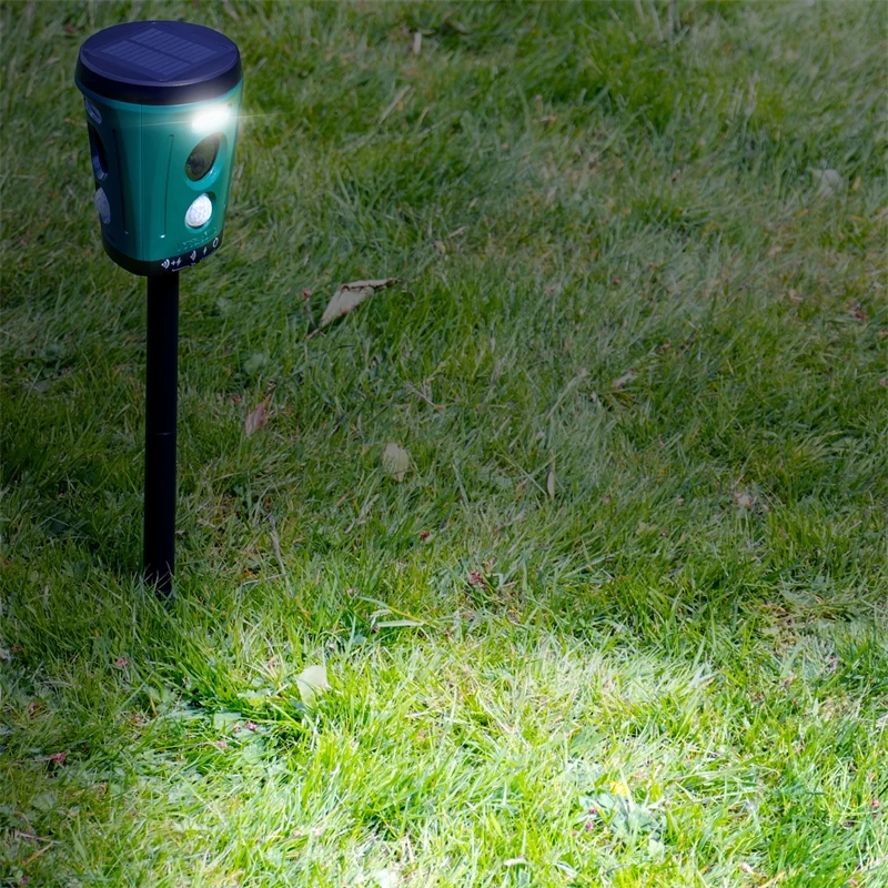 Sobald der Bewegungsmelder aktiviert wird, beginnt das Gerät eine Gruppe von ständig wechselnden Ultraschallfrequenzen auszusenden. Die Tiere können sich üblicherweise nicht an die ständig wechselnden Gruppen von Schall- und Ultraschall gewöhnen. Sie werden aus dem beschallten Gebiet vertrieben. Der zuschaltbare 3-fach Blitz verstärkt die Abschreckung.