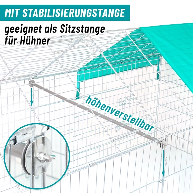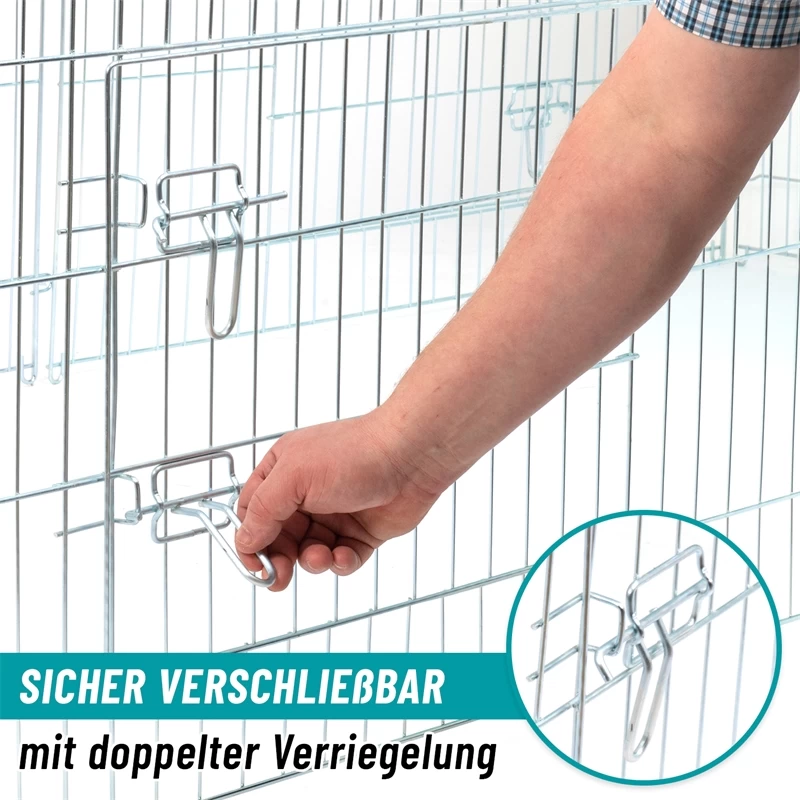 Das große Freilaufgehege kann schnell und einfach errichtet werden, ist aber auch für eine platzsparende Lagerung flach zusammenlegbar. Die verzinkten Zaunelemente werden durch Stäbe miteinander verbunden. In zwei der seitlichen Zaunelemente befindet sich je eine Tür mit 2-facher Verriegelung. Auch an der Frontseite befindet sich eine herausnehmbare Tür mit einfacher Verriegelung. In der Mitte des Käfigs befindet sich eine Befestigungs-, bzw. Sitzstange. Diese Stange gibt dem Gehege zusätzlich Stabilität und kann von Hühnern als Ruheplatz genutzt werden. Aber auch für die Haltung anderer Tiere hat sie ihren Nutzen, so kann man an ihr z.B. Spielzeug oder Leckerlis befestigen, um die Aktivität der Tiere zu fördern.