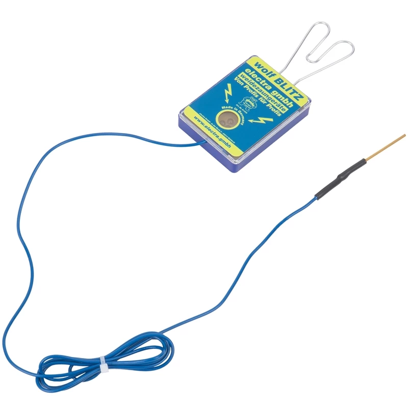 Durch das Blinken von 3 ultra-hellen blauen LEDs im Takt der Zaunimpulse (ab 2000 Volt), wird der Wolf durch den blauen Farbbereich meist schon vertrieben.
